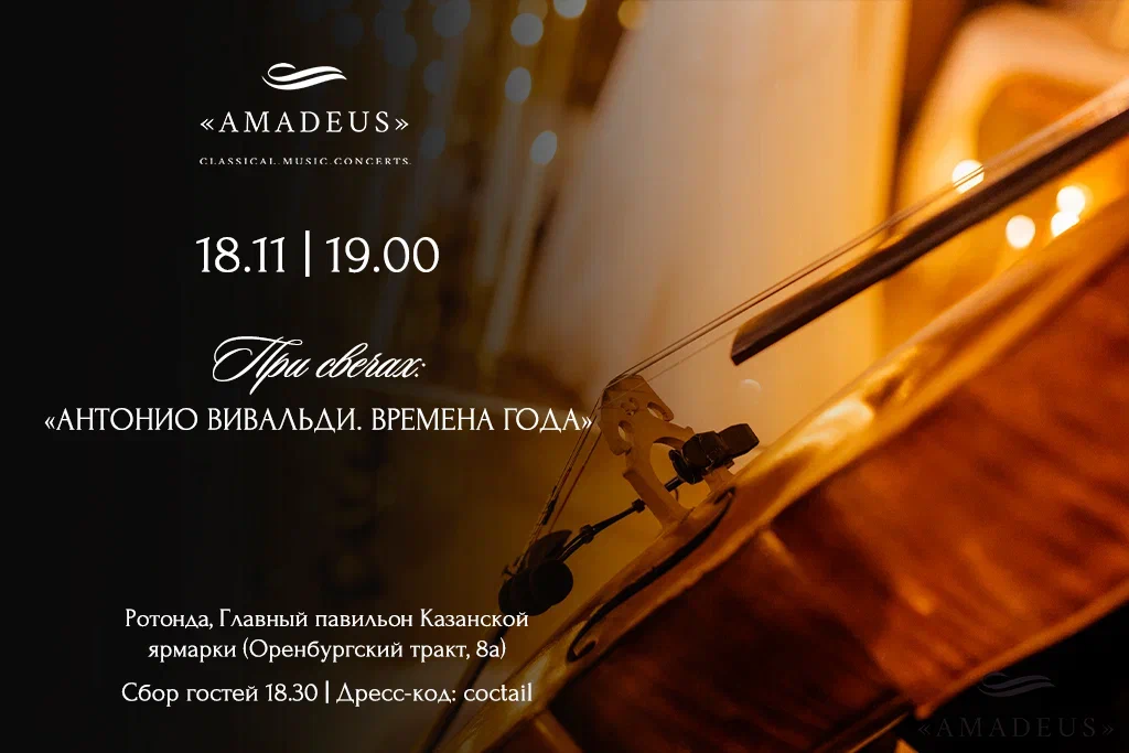 Величественные залы в строгих ампирных традициях, озаренные теплым мерцанием свечей, станут идеальным обрамлением для одного из самых знаменитых произведений эпохи барокко — цикла «Времена года» Антонио Вивальди. Струнный квартет виртуозно передаст всю палитру эмоций, заложенную композитором: от нежного дыхания весны до жаркого лета, от щедрой осенней радости до зимней стужи. Проникнитесь атмосферой вечера от «AMADEUS»: - Потрясающая акустика — высокие потолки и камерное пространство создают неповторимое звучание, приближенное к аутентичному исполнению XVIII века. - Мерцание свечей — приглушенный свет усиливает магию музыки, перенося слушателей в эпоху венецианских карнавалов и барочных салонов. - Живые эмоции — музыканты квартета играют без микрофонов, позволяя каждому зрителю ощутить «живое» дыхание звучания коллектива. - Погружение в атмосферу Италии XVIII века — страстной, изысканной и полной жизни. Программа концерта В центре вечера — «Le quattro stagioni» («Четыре времени года») в переложении для струнного квартета: - «Весна» (La Primavera) — пробуждение природы, пение птиц и шелест листвы. - «Лето» (L’Estate) — знойные лучи солнца и внезапные грозы. - «Осень» (L’Autunno) — праздник урожая, охота и народные танцы. - «Зима» (L’Inverno) — ледяной ветер, дрожь от холода и уют у камина. Дата и время: 18 ноября 2025, 19.00-20.00. Сбор гостей с 18.30 Место: Ротонда, Главный павильон Казанской ярмарки. (Оренбургский тракт, 8а) Официальный дресс-код: coctaile До встречи в мире гармонии и вдохновения вместе с «AMADEUS»!