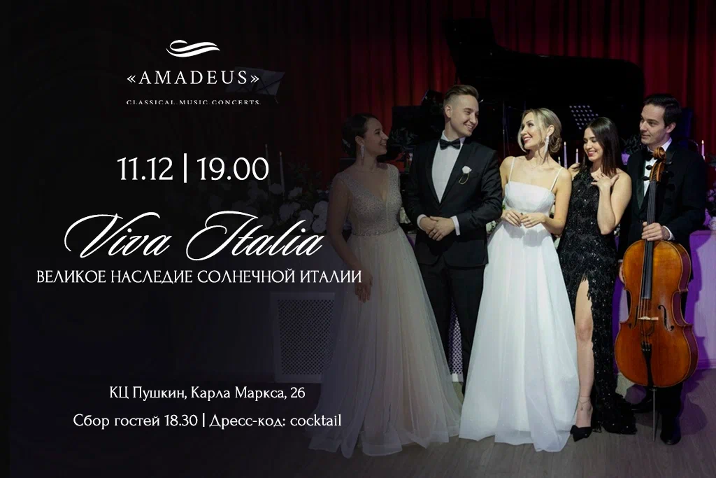 Одним красивым зимним вечером концертное движение «AMADEUS» приглашает вас отправиться в путешествие в солнечную Италию! Где в воздухе витает настроение «Dolce Vita» Где каждая фраза звучит на языке любви особенно ярко и вкусно. Где наслаждение жизнью – главное правило прекрасного времяпрепровождения! Страна богатой культуры, которая вдохновляла многих творцов во все времена – художников, поэтов, скульпторов, композиторов. Место на Планете, где были созданы одни из Лучших образцов мирового искусства. В программе концерта прозвучат солнечные неаполитанские песни, любимые оперные арии и самая знаменитая музыка итальянских композиторов. Исполнители: Эльвира Игламова Лауреат Международных конкурсов (организатор вечера, скрипка, рассказчик) Айрат Ганиев Заслуженный артист РТ (тенор) Адель Закиров Заслуженный артист РТ (виолончель) Сюмбель Киямова, Лауреат Всероссийских и Международных конкурсов (сопрано) Александра Луговцева Лауреат Международных конкурсов (рояль) Почувствуйте вместе с «AMADEUS» яркие краски, где все вокруг танцует и поет, где любовь звучит синонимом самой жизни. 11 декабря, Культурный центр А.С.Пушкина (Карла Маркса, 26) Сбор гостей 18.00-19.00 (фотосессия, welcome drinks) Концерт 19.00-20.30 Dress code: коктейль, вечерний Добро пожаловать на свидание с самой жизнью!